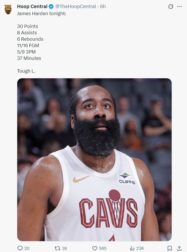 赛后这场比赛哈登拿到30+输球了,但他登场的比赛骑士9胜3负依旧出色,这位36岁的老将依旧存在联盟顶级战力。