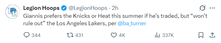 根据湖人记者Ryan Rueda的说法,雄鹿队没有在交易截止日前送扬尼斯的原因之一就是,字母哥希望在今夏与东契奇并肩作战,而且他知道湖人在休赛期开出的筹码会比交易截止日更好,也能帮助雄鹿队。